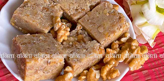 विधि - अखरोट को साफ करके मिक्सी में पीस ले। नॉनस्टिक पैन में पानी और चीनी मिला कर उबालें। पहला उबाल आने पर आंच को धीमा कर दें और चाशनी गाढ़ी होने तक पकाएं। दो तार की चाशनी बनने पर इसे आंच से उतार लें और इसमें अखरोट का पाउडर डालें। फिर से आंच पर रखें और लगातार चलाती रहें। इसमें अखरोट के टुकड़े और जायफल पाउडर मिलाएं। अब आंच से उतार लें और चिकनाई लगी थाली पर बटर पेपर को गोल काट कर सेट करें। तैयार मिश्रण को बटर पेपर लगी थाली में निकाल लें। बेलन की मदद से मिश्रण को फैला दें। ठंडा होने दें और मनचाहे आकार में काट लें।