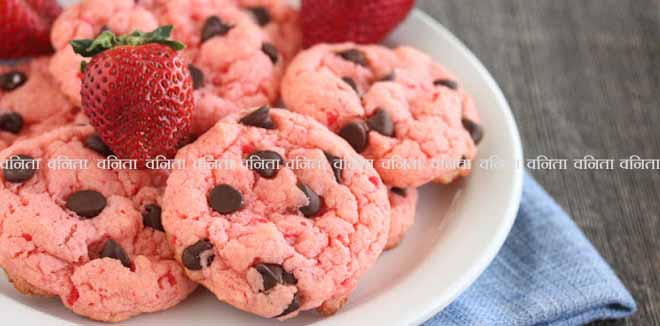 विधि: कटे स्ट्रॉबेरी को मिक्सी में डाल कर पेस्ट बनाएं। मैदा, चीनी, बेकिंग पाउडर और नमक को छान कर बरतन में रखें। दूध, अंडा और वनिला एसेंस को फेंटें। इसमें मैदे का मिश्रण धीरे-धीरे मिलाएं। जरूरत से ज्यादा ना फेंटें वरना इससे बबल्स बनने लगेंगे। अब इसके छोटे-छोटे बॉल्स बनाएं और चपटा कर लें। सभी कुकीज पर चॉकलेट चिप्स लगाएं। अवन को प्रीहीट करें। प्रीहीट करने पर बेकिंग अच्छी होती है। इसमें चिकनाई लगी बेकिंग ट्रे में स्ट्रॉबेरी कुकीज रखें और 15 मिनट तक बेक करें।