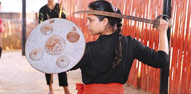 कमर पर लाल कपड़ा बांधे लड़कियों का ग्रुप कलारिपयट्टू करना शुरू करता है, तो आसपास खड़े लोग चार कदम पीछे हट जाते हैं। जैसे इनके अंदर शेर, बाघ, हाथी, सांप और मगरमच्छ जैसे खतरनाक जानवरों की ताकत और जोश समा गया हो। खतरनाक लड़ाकू शैली में जब तलवार और ढाल उठा कर वे सामने वाले पर वार करती हैं, तो वाकई एेसा महसूस होता है कि युद्ध आरंभ हो गया है। जिस तेज गति से यह वार होता है उतनी ही तेज गति से दूसरी युवती हवा में उछल कर प्रतिद्वंद्वी के कंधे पर तलवार रखते हुए उसे चुनौती देती है। देर तक दोनों एक-दूसरे पर तलवार से हमला करने और ढाल से खुद को बचाने का अभ्यास करती रहती हैं। इस बीच अलग-अलग हथियारों के साथ महिलाअों को इसका अभ्यास करते देखना वाकई अदभुत है। यह मंजर तब और भी जोशभरा हो जाता है, जब 6-7 साल की छोटी-छोटी बच्चियां फुर्तीली रफ्तार से हाथ-पांव को हवा में तेज धार हथियार की तरह लहरा कर एक्शन करती हैं। इनका पूरा झुंड जब एक साथ एेसा करता है, तो हाथ-पैर के तेजी से हवा में चलने पर जो ध्वनि उत्पन्न होती है, वह रोमांचित कर देती हैं। यकीन करें, उनको देख रहा हर व्यक्ति तब उस युद्ध कौशल में कूद पड़ने को उत्साहित हो जाता है।