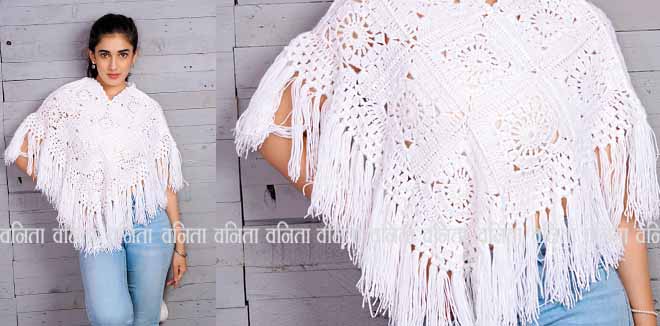 निर्देश: इस पोंचू को बनाने के लिए 16 मोटिफ्स बनेंगे। 8 मोटिफ्स आगे के भाग में और 8 पीछे के भाग के लिए। इन्हें ड. क्रोशिए से जोड़ कर पोंचू बनाएं।
