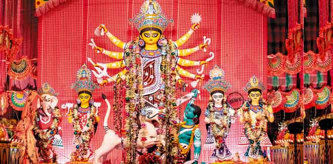 मधुश्री पूजा के बारे में बताती हैं, ‘‘माना जाता है नवरात्रि में देवी दुर्गा पीहर आ रही हैं। ये सेलिब्रेशन 5 दिन का होता है, लेकिन इसकी तैयारी 2 महीने पहले से शुरू हो जाती है। जिस दिन रथ यात्रा शुरू होती है, उस दिन से इस मूर्ति की नींव पड़ जाती है यानी दुर्गा जी की काठामोह मतलब मूर्ति की फ्रेमिंग शुरू हो जाती है। पूजा के 5 दिन बहुत मुख्य माने जाते हैं। पंचमी के दिन बाजे-गाजे और सत्कार के साथ मूर्ति को पंडाल में लाते हैं। पंचमी के दिन कलश की स्थापना करते हैं। दुर्गा मां का स्वागत करते हैं। षष्ठी पूजा में सभी लोकल परिवार पंडाल में आते हैं। वहां पुरोहित पूजा करते हैं। घर-परिवार में बच्चों के लिए पूजा रखी जाती है। इसी दिन शाम को मूर्ति में प्राण-प्रतिष्ठा की जाती है। सुबह अंजली पूजा और शाम को आरती की जाती है। शाम के समय में एक अलग तरह का भोग चढ़ाया जाता है, उसे शीतल भोग कहा जाता है। उसमें पूरी, हलवा, मिठाई चढ़ती है। सप्तमी के दिन सुबह पूजा होती है, उसके बाद अंजली दिया जाता है। भोग दिया जाता है। इस भोग विशेष को बनाने के लिए महिलाएं दोपहर में जुटती हैं। इसे मूल भोग कहा जाता है, जो हर दिन नया बनता है। रेसिपी रिपीट नहीं होती। शाम को पूजा के बाद लोगों को भोग दिया जाता है। यह सामान्य भोग से अलग होता है।